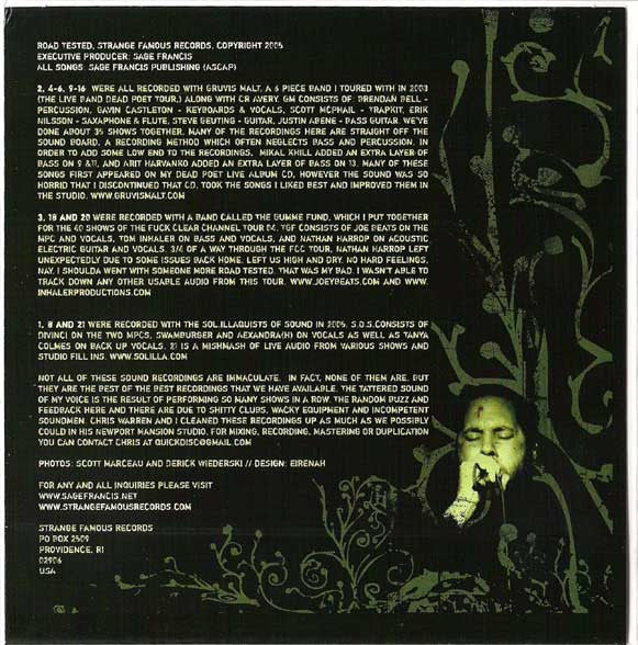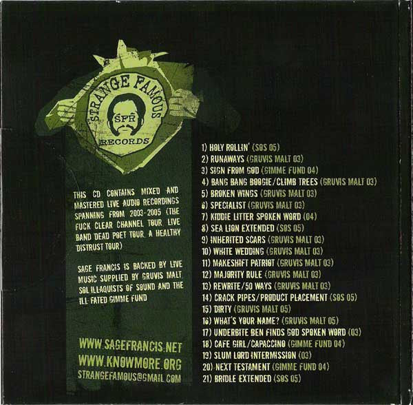All songs: Sage Francis Publishing (ASCAP) Sage Francis toured with Gruvis Malt in 2003 on The Live Band Dead Poet Tour, and many of those tracks were recorded off of the sound board, a method which often neglects bass and percussion in order to add some low end to the recordings. Additional layers of bass were added on tracks 9, 11, and 13. The Gimme Fund was put together by Sage Francis for the Fuck Clear Channel Tour 04. They are mis-credited as The Gumme Fund at places in the liner notes. The Sol.Illaquists Of Sound recorded with Sage Francis in 2005. Track 21 is a mishmash of live audio from various shows and studio fill-ins. 2: Recorded at the Call in Providence, RI. 7: Live in Fort Collins. 14: From Rock the Bells 17: Live in Sioux Falls Packaged in a cardstock gatefold sleeve.