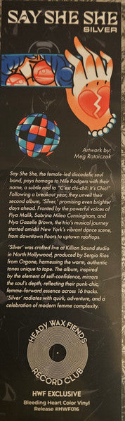 Heady Wax Fiends exclusive "Clear with Red Swirl", limited to 800 copies. Housed in a mirrored silver-board gatefold sleeve. Issued with 12"x12" glossy insert with photo of band on one side and credits on the other. Issued in paper backed plastic company inner sleeves: "Soulful sounds are on Colemine Records". Issued with download card for digital edition of [r=28556818. [Hype Sticker - "Karma Chief a division of Colemine Records" - "Say She She Silver KCR-12024" - "'Boundary Busting Discodelic Soul!' ★★★★★ The Guardian" - "Mastered by JJ Golden at Golden Mastering" - "Lacquers cut at Well Made Music" - "Pressed at Gotta Groove Records" - "Includes photo insert and download card" - "Heady Wax Fiends Exclusive", barcode 674862662074, "/800"