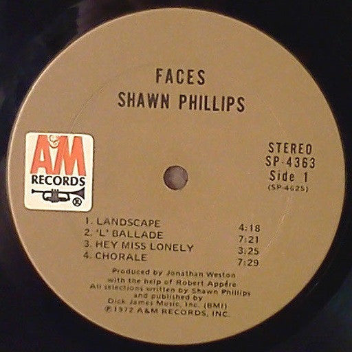 1972, A&M Records, Inc. Printed in U.S.A. All selections published by Dick James Music, Inc. (BMI) Shawn Phillips, "Faces" An anthology of music from 1969 A&M Records, Inc. P.O. Box 118, Hollywood, CALIF. 90028