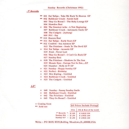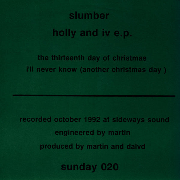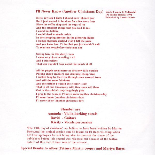 Recorded October 1992 at Sideways Sound (P) Sunday Records 1992 (back cover) "I'll Never Know (Another Christmas Day)" published by Leaves Music. "'The 13th day of christmas' we believe to have been written by Martyn Bates ..." (liner notes)