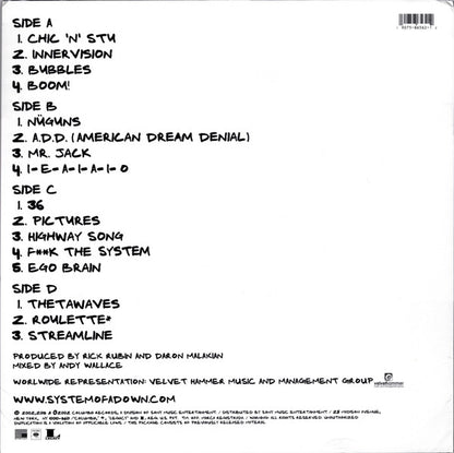 'This package consists of previously released material.' Serj's Poem on the cover of side B goes as follow: "★Contraband contradictions, concocting contractions conceding to caucasian caucases causing casual conclusions concerning inconclusive karma, masking masochistic mosquito massages in masculine mosques, a must see mosaic ! Take your tartar sauce, and your Tinseltown tactics to a Tic-Tac filled trumpet and blow. Enjoy the eloquent essence of esoteric engines humming in Ecstasy, Etc. Actual arctic acronyms were asked to ascertain the astral auspices of acting astericks, that's ass! She sells sea shells BUY THE REAL WH★RE !" Track 13 (Side C - Track 4) 'F**k The System' is misspelled 'F*** The System' on Lyrics Sheet. "I-E-A-I-A-I-O" contains interpolations from "Knight Rider" written by Stu Phillips and Glen Larson. Courtesy of Songs Of Universal, Inc (BMI) Recording location: Cello Studios, Los Angeles CA and Akademie Mathematique of Philosophical Sound Research, Los Angeles, CA. Mixed at Enterprise Studios, Burbank, CA and Akademie Mathematique of Philosophical Sound Research, Los Angeles, CA. Mastered at Sony Music Studios All songs © 2002 Sony/ATV Tunes LLC and DDevil Music. All rights administered by Sony / ATV Music Publishing. ©2002, 2018 & ℗2002 Columbia Records.