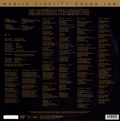 1/4" / 15 IPS Analog Copy To Lathe. 45rpm. Dual-pocket gatefold. Special edition. ℗ 1971 & 2019 Warner Records Inc. Produced under license from Warner Records Inc. Manufactured by Rhino Entertainment Company, a Warner Music Group Company © 2019 Mobile Fidelity Sound Lab ®, Inc. Printed in the U.S.A. Mastered by Krieg Wunderlich at Mobile Fidelity Sound Lab ®, Sebastopol, CA on the GAIN 2 ULTRA ANALOG SYSTEM™. Specially Plated and Pressed on 180g High-Definition Vinyl. Production by Mobile Fidelity Sound Lab®
