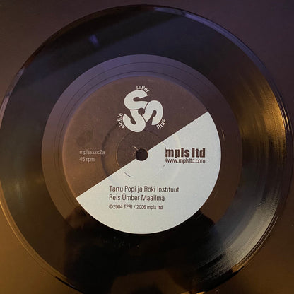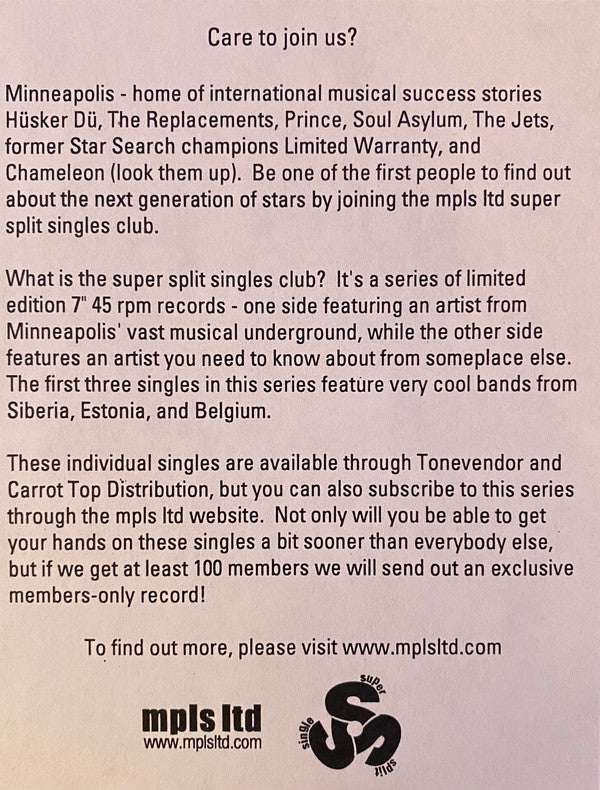 "What is the super split singles club? It's a series of limited edition 7" 45 rpm records - one side featuring an artist from Minneapolis' vast musical underground, while the other side features an artist you need to know about from someplace else." Tartu Popi Ja Roki Instituut - sensodynamic Estonian pop Basement Apartment - fuzzed out power-pop from Minneapolis Ltd to 500 copies. Side A: ©2004 TPRI Side B: ©2006 Pine Tree Hill Music