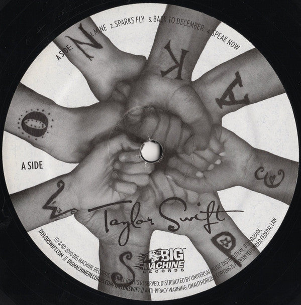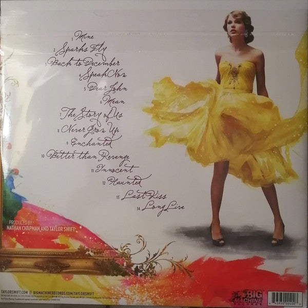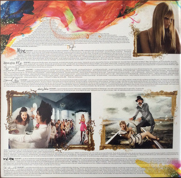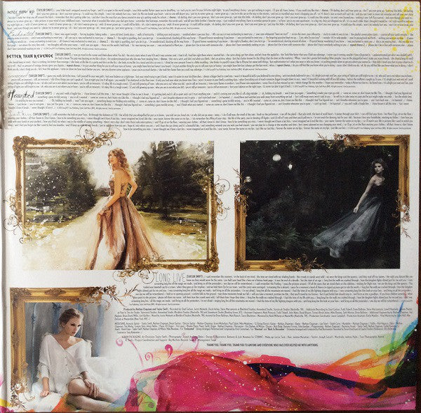 Packaged in a gatefold sleeve. Track durations are not listed on the release. ℗ & © 2010 Big Machine Records, LLC All songs © 2010 Sony/ATV Tree Publishing, Taylor Swift Music (BMI) Recorded [... at Blackbird Studios, Aimeeland Studio, Starstruck Studios (Nashville, TN) Additional recording [... at Pain In The Art Studio, Starstruck Studios, Aimeeland Studio, Blackbird Studios (Nashville, TN) and Stonehurst Studio (Bowling Green, KY) Mixed [... at Blackbird Studios (Nashville, TN) Mastered [... at MasterMix (Nashville, TN) Vinyl mastering [... at Masterdisk (New York, NY) For "Haunted" and "Back To December" - Orchestra [... recorded at Capitol Studios (Hollywood, CA) Design & Illustration: Bethany & Josh Newman for ST8MNT