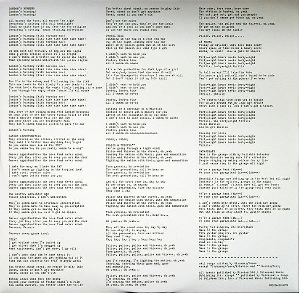 Includes a custom inner lyrics sleeve. Cover sticker: "Fully Remastered, 180G Audiophile Vinyl Pressing" Rear sleeve: All songs copyright control except [B4 Blue Mountain Music Ltd. Remastered [... at Metropolis. ℗ & © 1977, 2013 Sony Music Entertainment UK Limited / Distributed by Sony Music Entertainment / 550 Madison Avenue, New York, NY 10022-3211 Inner sleeve: All tracks published by Nineden Ltd / Universal Music Publishing Ltd. except [B4 published by Universal - Songs Of PolyGram Int., Inc. / Universal Music Publishing Ltd. Pressing and lacquer cutting credits are identified in runout etchings.