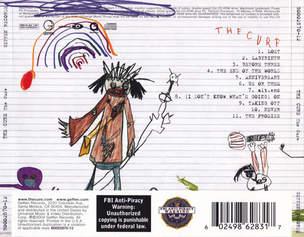 ℗ © 2004 Geffen Records. All rights reserved. Printed in the U.S.A. Recorded & mixed at Olympic Studios, London Spring 2004. Mastered at Sterling Sound, NYC. Demos recorded at Stanbridge. This album was recorded live in a candlelit room & mixed very loud in the dark... We know you should turn down the lights and turn up the sound for your optimum listening pleasure. All rights for the US on behalf of BMG Music Publishing Ltd. (PRS) administered by BMG Songs, Inc. (ASCAP) DVD 'Making The Cure' filmed by Rob Fisher & Ross & Steve & Owen & The Cure, Edited by Robert & Roger for Curevision using the Mac Movie 4, Soundtrack by The Cure. The enhanced section includes a "secret" link to the Cure's website featuring a Robert Smith interview, demos, photos and a gallery of the album's artwork.