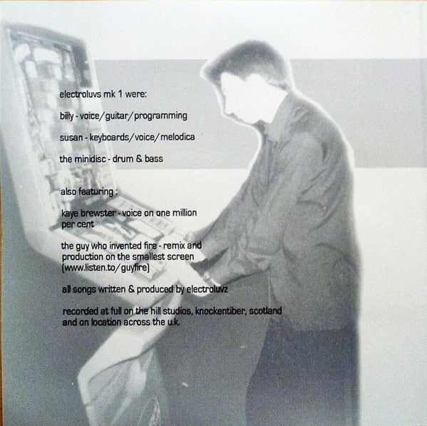 Recorded at Full On The Hill Studios, Knockentiber, Scotland and on location across the U.K. Recorded on computer, 8 track analogue and even ghettoblaster! Manufactured in Western Scotland by Xstatic Records. Released on a black CDr. Collection of Electroluvs EPs and previously unreleased material 1999-2003: Track 1 first released on [r11422290. Recorded February 2002. Track 2 first released on "Nu Nitemare E.P." (Xstatic 2002). Recorded January 2002. Track 3 recorded February 2002. Track 4 recorded May 2002. Track 5 from "The Great Unknown" (Xstatic 1999). Re-recorded version March 2002. Track 6 recorded September 2002. Track 7 first released on "Balti E.P. (Xstatic 2001). Recorded July 2000. Track 8 recorded October 2001. Track 9 first released on "Return Of Generation Toyracer" (Toyracer Recordings 2002). Re-recorded May 2002. Track 10 first released on "Nu Nitemare E.P." (Xstatic 2002). Recorded January 2002. Track 11 remixed May 2002. Tracks 10 and 11 are just listed as "He's A Nitemare" and "The Smallest Screen". Track 11 has a total duration of 10:28. There is an uncredited hidden track after 3:35 of silence.