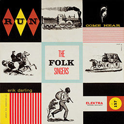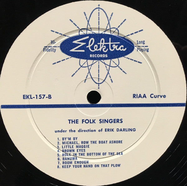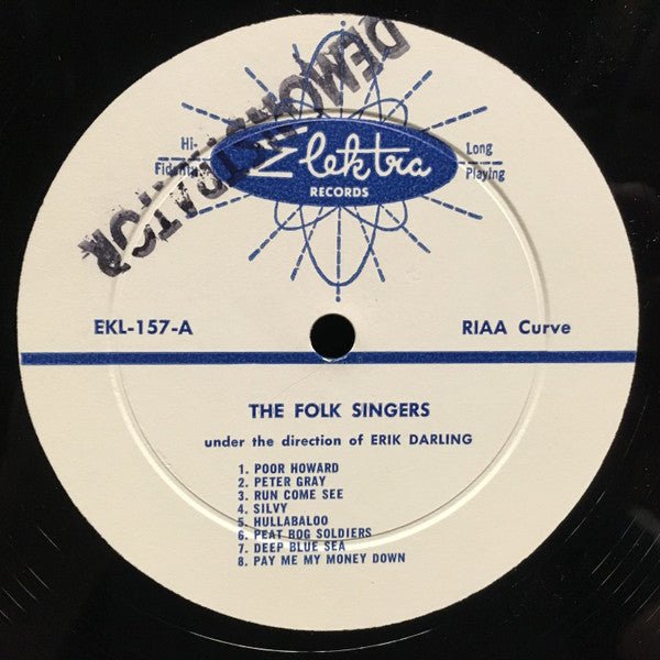 "Under the Direction of Erik Darling." The Folk Singers are Erik Darling, Dylan Todd, Don Vogel and Caroly Wilcox. Title apparently is "The Folk Singers," per the back cover, label and spine. The front cover title arguably is "Run Come Hear The Folk Singers," as those words appear as part of a series of panels, apparently alluding to the song "Run Come See". The song "Deep Blue Sea" was performed with other non-album tracks in the 1958 Broadway Musical Comedy Revue entitled 'The Next President'. The show ran from April 9th to April 19th, seeing 13 audiences. White label with blue print and "atom" logo. Original release.