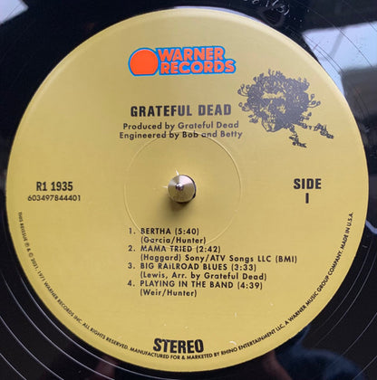 Labels state "Made in U.S.A.", as apposed to "Made In Germany" on [r=19427980. Comes with a round The Grateful Dead sticker and a promo-flyer for the "Skull & Roses" season of "The Good Ol' Grateful Dead" podcast. There are some discrepancies for the duration of the tracks between the cover and the labels. On Sticker: Grateful Dead (Skull & Roses) R1 1935 50th Anniversary Edition The Dead's First Gold Album Recorded Live Entirely In New York & San Francisco Remastered on 2 LPs 180 Gram Vinyl Produced for Release by David Lemieux