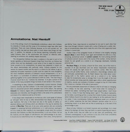 Issued with an Acoustic Sound Series 'Releases beginning in 2020' color insert and vinyl housed in a non-labelled rice paper inner sleeve From back cover: Recorded 1964 Printed in U.S.A. A Verve Records release. Originally released in 1964 on Impulse! Records © 2021 UMG Recordings, Inc., 1755 Broadway New York, NY 10019 - U.S.A. Distributed by Universal Music Enterprises, A Division of UMG Recordings, Inc. From labels: Printed in U.S.A. A Verve Records release. Originally released in 1964 on Impulse! Records © 2021 UMG Recordings, Inc. From inside front cover: Recorded April 27 and June 1, 1964 From Acoustic Sounds Series sticker: • Mastered from the original analog tapes by top mastering engineers • Manufactured at Quality Record Pressings (QRP) on 180 gram vinyl • Gatefold sleeves printed at Stoughton Printing Company Runouts: Etched except 'STERLING' is stamped both sides