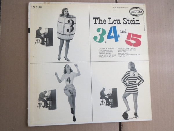 Artist/title named "The Lou Stein 3, 4 and 5" on the front cover, but spelled out "The Lou Stein Three, Four and Five" on the labels, rear cover and spine.