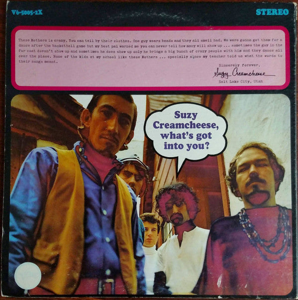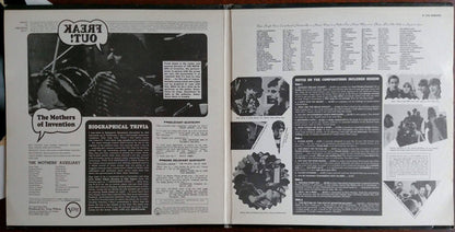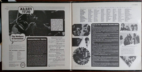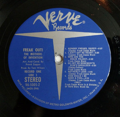 Blue labels with silver print. No company address appears on labels. Cat# V6-5005-2X on cover/spine, V/V6-500502 at the innerspread and V6-5005-2 on labels. Identical to [r7438068 but has V6-5005-2X on spine. "Freak-Out Hot-Spots" map/poster offer printed inside gatefold on right-hand side. A4 appears on the label as "Go Cry On Somebody's Else's Shoulder". C1 appears on the label as "Trouble Comin' Every Day". Side D title uses "Tableaus" spelling on label and "Tableaux" spelling on sleeve. All tracks Frank Zappa Music Frank Zappa Music Is A Division Of Third Story Music Co. All Compositions BMI ®© Metro-Goldwyn-Mayer Inc./Printed in U.S.A ------------------------------------ For the similar counterfeit with different runouts see [r12053719