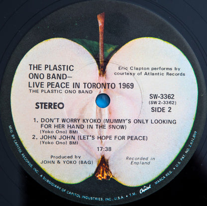 Subsidiary Capitol Label. Side 2 Rim print on label reads,"MFD BY CAPITOL RECORDS, INC., A SUBSIDIEARY OF CAPITOL INDUSTRIES INC. U.S.A. TM (CAPITOL LOGO HERE) MARCA REG U.S. PAT. NO. 2,631,859" The album documents John Lennon's first live performance apart from the Beatles. The original release included a 1970 calendar with photographs of John and Yoko. Some of the calendars were bound with wire, some were bound with plastic, while others were bound with a saddle staple. No individual track lengths listed for B-side, only total side time of 17:38