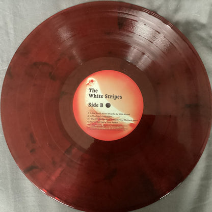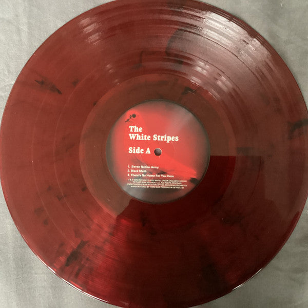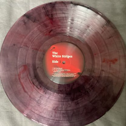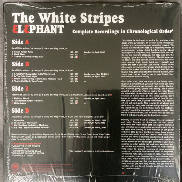 Gatefold sleeve. Comes with printed inserts. Runouts are etched. Embossed lettering on the back side: "The White Stripes" "Elephant" "Side A" "Side B" "Side 3" "Side D"