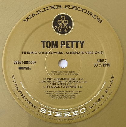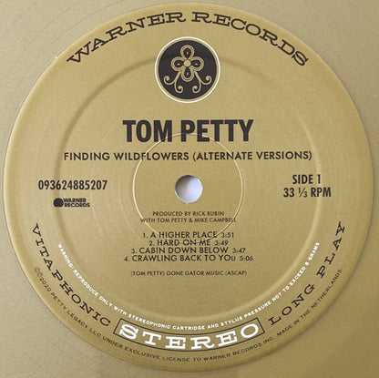 Limited edition gold vinyl initially released as an exclusive to indie retail and artist web store. Hype sticker affixed to shrink: Wildflowers Alternate Versions 16 Songs on 2 LPs Studio Outtakes from the Original Recording Sessions (1992-1994) Limited Edition Gold Vinyl Issued in non-gatefold jacket with four-page folded insert with artwork, notes and credits. All tracks published by Gone Gator Music (ASCAP) except: B3, D2: Gone Gator Music (ASCAP)/Wild Gator Music (GMR) Recording details from insert: A1, B2: Previously unreleased recording - December 3, 1992; recorded at Sound City Studios A2: Previously unreleased recording - January 25, 1993; recorded at Sound City Studios A3: Previously unreleased recording - July 27, 1993; recorded at Ocean Way Recording A4, C2: Previously unreleased recording - July 28, 1993; recorded at Ocean Way Recording B1: Released as the B-side on "614592" and Wildflowers EPK; recorded at Sound City Studios B3, B4: Previously unreleased recording - July 14, 1994; recorded at Sound City Studios C1: Previously unreleased recording - August 11, 1992; recorded at Hocus Pocus Recorders C3: Released as the B-side on "171970"; recorded at Sound City Studios C4: Released as the B-side on "303982"; recorded at Sound City Studios D1: Previously unreleased recording - June 3, 1993; recorded at Ocean Way Recording D2: Released on 1429413 (2018) - Different version from 74309 original release; recorded at Sound City Studios D3: Released on 1429413 (2018) - Different version from 74309 original release; recorded at Hocus Pocus Recorders D4: Previously unreleased song and recording - August 12, 1992; recorded at Hocus Pocus Recorders Compilation Mastered at Bernie Grundman Mastering. Jacket: Warner Records Inc., A Warner Music Group Company. © 2021 Petty Legacy LLC under exclusive license to Warner Records Inc. ℗ 2020 Petty Legacy LLC under exclusive license to Warner Records Inc. Made in the Netherlands. Labels: ©℗ 2020 Petty Legacy LLC Under Exclusive License To Warner Records Inc. Made In The Netherlands. Insert: © 2021 Petty Legacy LLC under exclusive license to Warner Records Inc. Runouts: 093624892991-S̶ CB / 093624899105-P CB / 093624892991-u̶ CB / 093624899105-R CB are etched; remainder is stamped