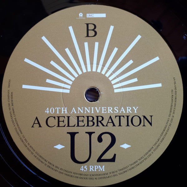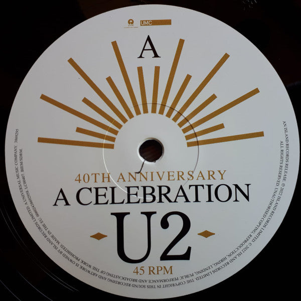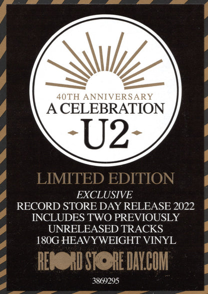 Hype Sticker: 40th Anniversary A Celebration U2 Limited Edition Exclusive Record Store Day Release 2022 Includes two previously unreleased tracks 180g heavyweight vinyl recordstoreday.com 3869295 Sticker on shrink: "Made in Germany" 7500 copies