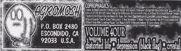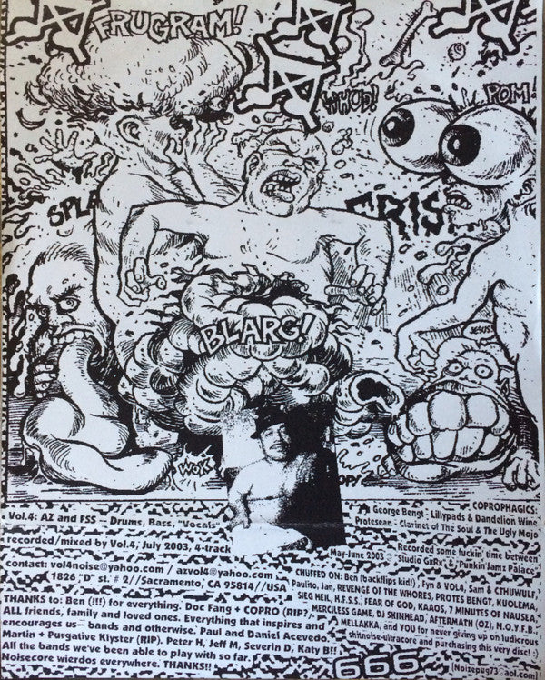 Volumefour recorded/mixed July 2003, 4-track. Coprophagics recorded some fuckin' time between May-June 2003 @ "Studio GxRx" & "Punkin' Jamz Palace". Catalog number is taken from the matrix. Side A plays @ 45 RPM. Side B plays @ 33 ⅓ RPM.