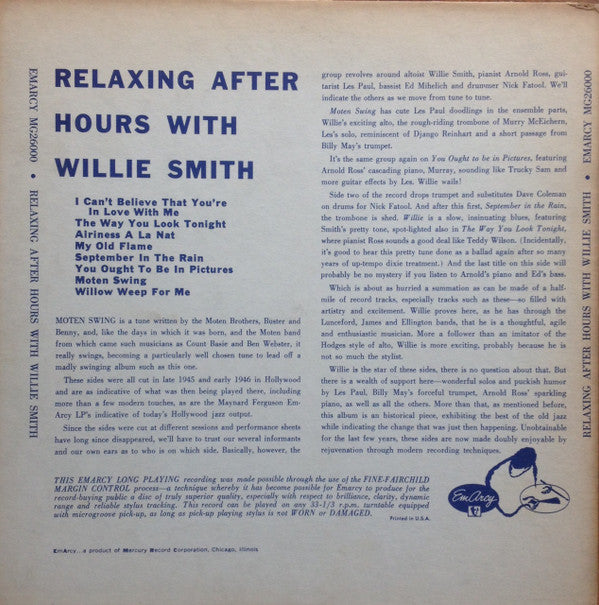 Only a partial compilation. Six of these tracks were previously issued as ten-inch 78 RPM records in 1945/46 on Keynote. A1: [matrix HL 121-2 recorded 16 February 1946, Los Angeles; A2: [matrix HL 122-4 recorded 16 February 1946, Los Angeles; A3: [matrix HL 123-2 recorded 16 February 1946, Los Angeles; A4: [matrix HL 124-3 recorded 16 February 1946, Los Angeles; B1: [matrix HL 90-2 recorded 2 May 1945, Los Angeles; B2: [matrix HL 91-5 recorded 2 May 1945, Los Angeles; B3: [matrix HL 92-5 recorded 2 May 1945, Los Angeles; B4: [matrix HL 93-2 recorded 2 May 1945, Los Angeles. A2 and A3 originally released as Keynote K-629 as by The Keynoters; B1 and B4 originally released as Keynote K-620 as by Willie Smith And His Orchestra Featuring Les Paul (note side B was then titled, "Willie..." instead of "Willow"; B2 and B3 were originally released on disc in 78 RPM multi-record set Keynote Album K-143; A1 and A4 apparently were not released prior to this LP. While drummer [a330704 is credited on the jacket front, he is not among the performers credited in Ruppli and Novitsky's "The Mercury Labels," discography, Volume 1, which is the source of all the other musicians named on this page.