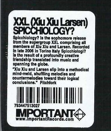 Recorded, mixed and mastered at O.F.F., Torino, Italy, Dec. 2006/Jan. 2007. The <a href="/release/983558">first 1000 copies</a> come with a bonus disc of live studio rehearsal sessions. Presented in a six-panel digipak. The front cover credits this release to Xiu Xiu Larsen, the sides only list XXL.