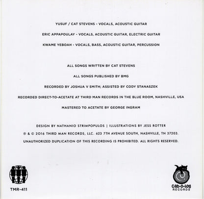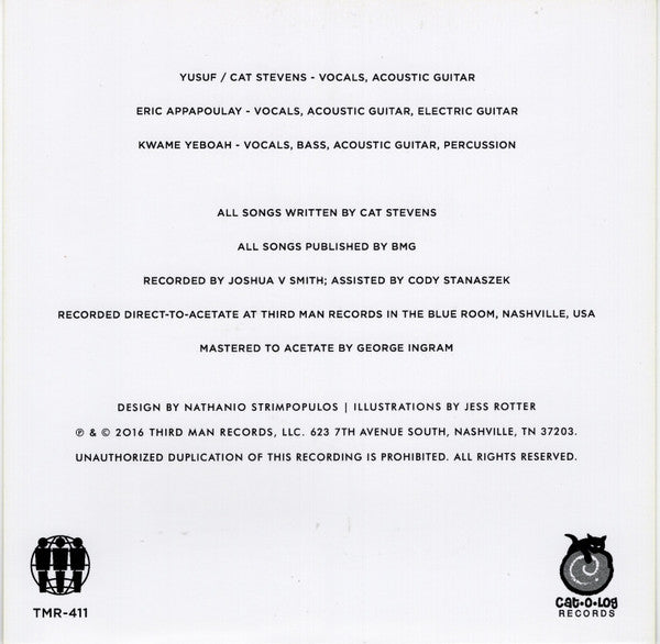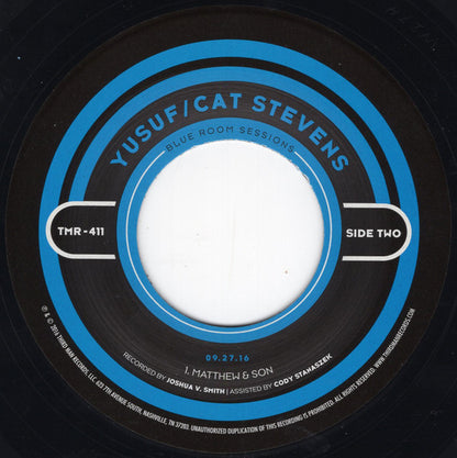 Wrap around picture sleeve with credits on the inside, plain white die-cut paper inner sleeve all contained in poly-bag. * 50th anniversary re-recordings of Yusuf/Cat’s first two singles * Second release as part of the Blue Room Sessions series Recorded direct-to-acetate at Third Man Records in the Blue Room, Nashville, USA Mastered to acetate by George Ingram Timings not listed on sleeve or label.