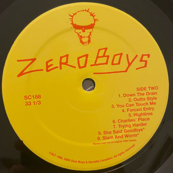 Album includes download code and 4-page insert containing liner notes, lyrics, photos, credits and other info. This version has an alternate hype sticker and the last line of the liner notes by Jack Rabid is missing (see images). Tracks B8 and B9 are bonus tracks not available on the original 1982 release. The back sleeve is incorrect as tracks B8 and B9 are swapped; on the label & record, "She Said Goodbye" appears before "Slam And Worm". All selections published by Z E R O B O Y S Music (B.M.I.). Ⓒ&Ⓟ 1982, 2009 Zero Boys & Secretly Canadian.